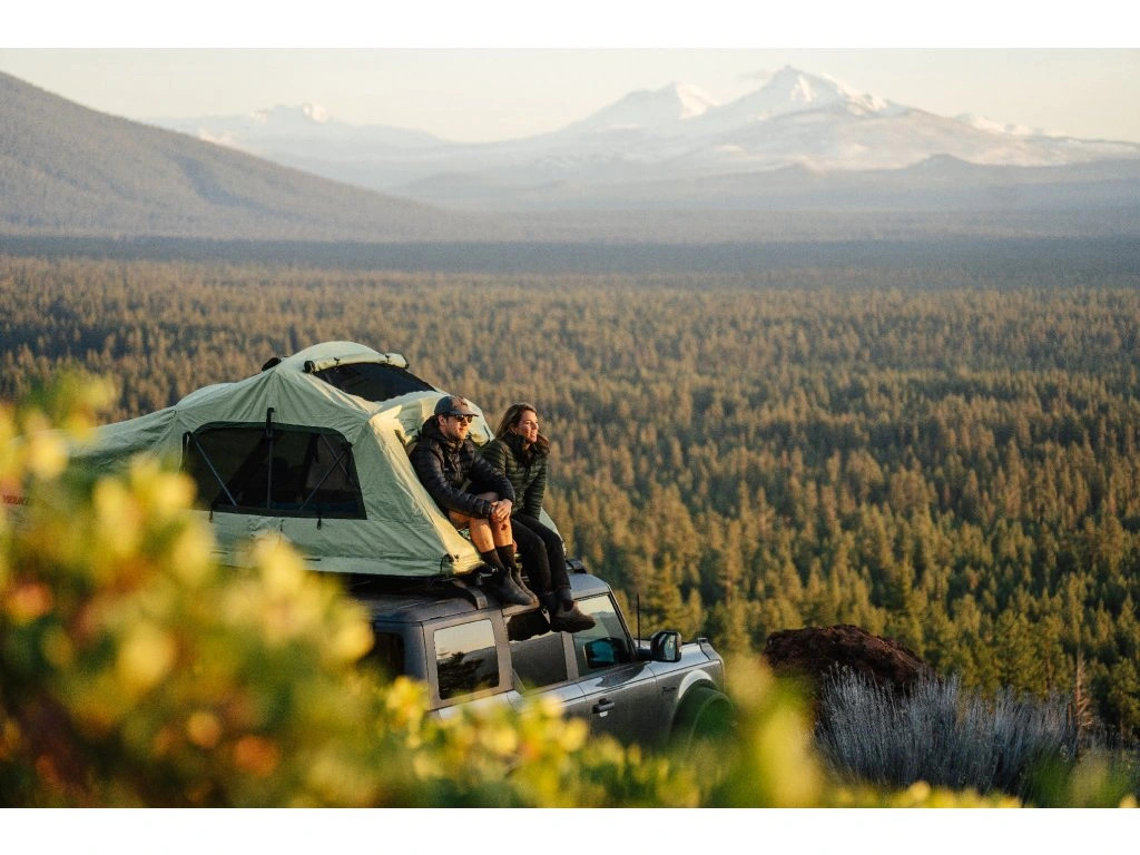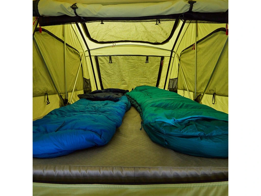 Rychle rozložitelný softshellový autostan Yakima SkyRise HD MD Green pro 2 osoby s prodlouženou přední částí pro krytý vstup po žebříku.
