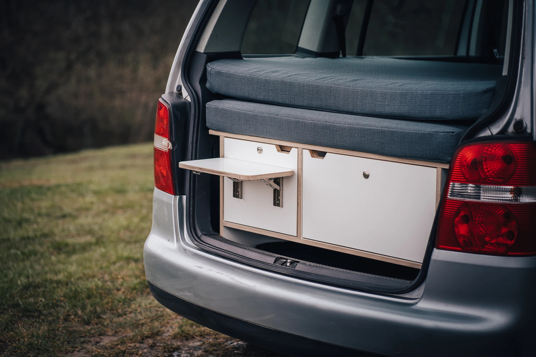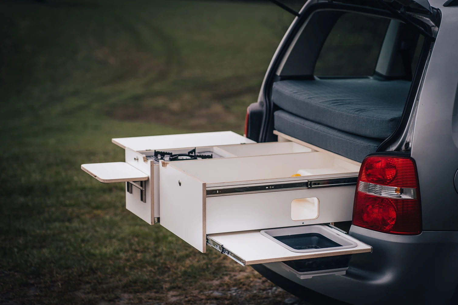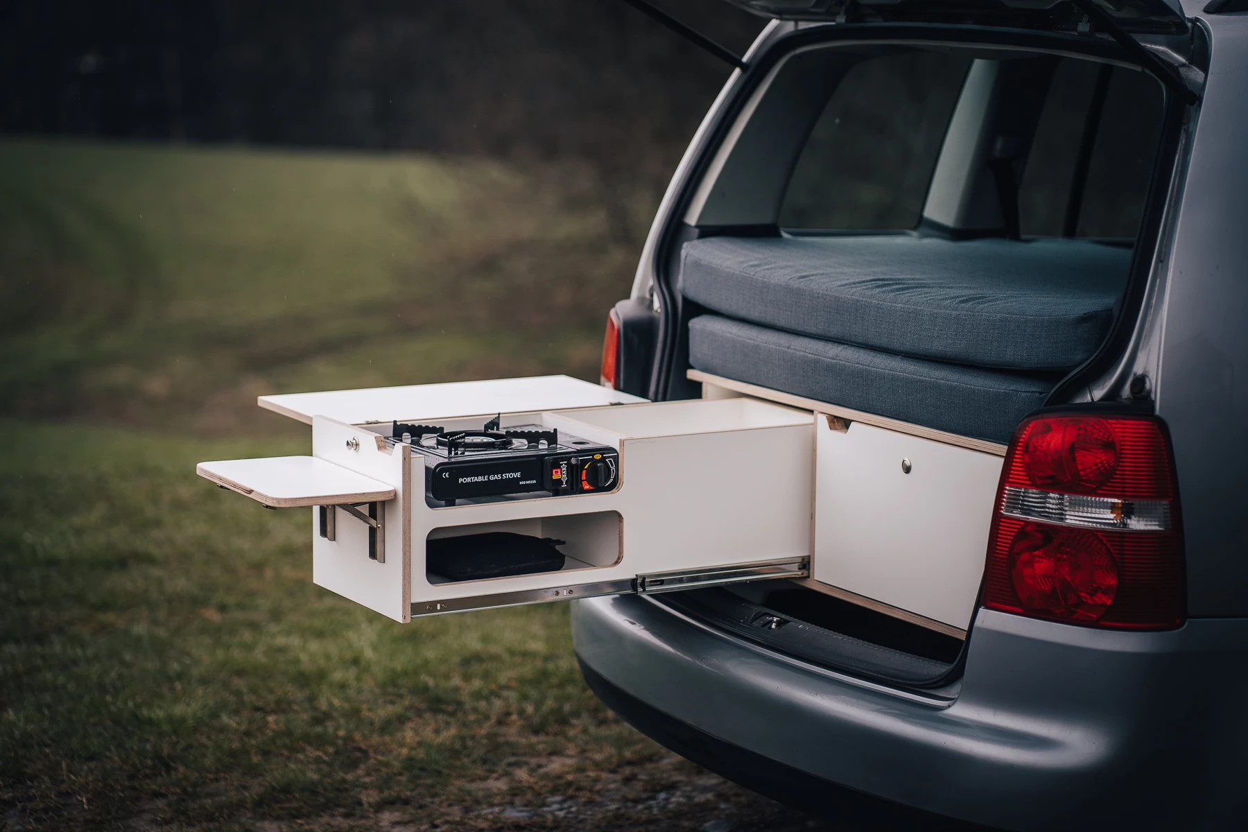 CAMPEESbox I přemění Váš automobil na nezávislé bydlení na kolech, po rozložení vznikne plnohodnotná postel, kempovací kuchyně s plynovým vařičem, dřezem a spousta odkládacích úložných prostorů pro Vaše vybavení na cesty.