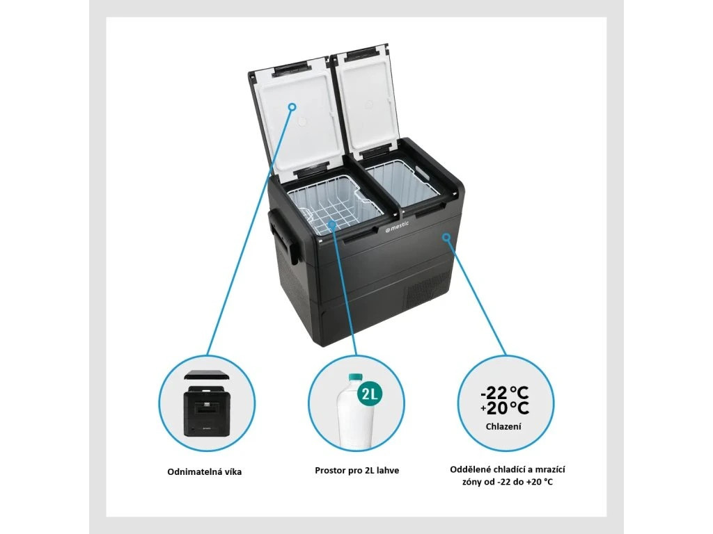 Extra prostorná kompresorová chladnička Mestic MCCM-55 AC/DC s objemem 55 litrů zajistí, že vaše jídlo a nápoje zůstanou v chladu nebo hluboce zmrazené za všech okolností. Tento robustní box pracuje zcela nezávisle na okolní teplotě a umožňuje nastavení v širokém rozsahu od -22 °C do +20 °C. Je to dokonalé řešení pro dlouhé cesty, kempování mimo civilizaci i pro domácí použití. Díky aplikaci Mestic ji navíc můžete snadno ovládat přes Bluetooth nebo Wi-Fi.