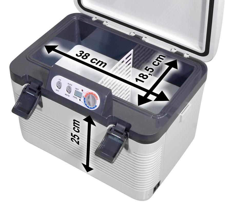 Přenosný chladicí box s možností ohřevu, napájení ze zásuvky autozapalovače 12 V nebo 24 V a také z běžné zásuvky 230 V, vnitřní objem 19 litrů. Ideální společník na cesty, na dovolenou, na piknik, nebo i na nákupy.