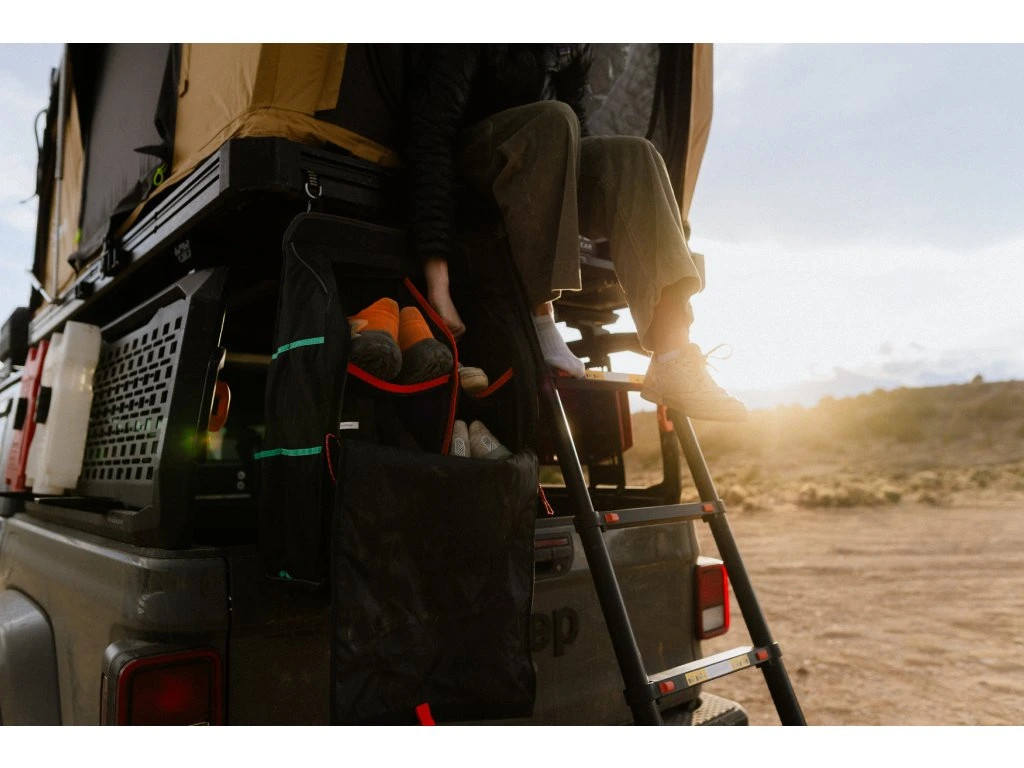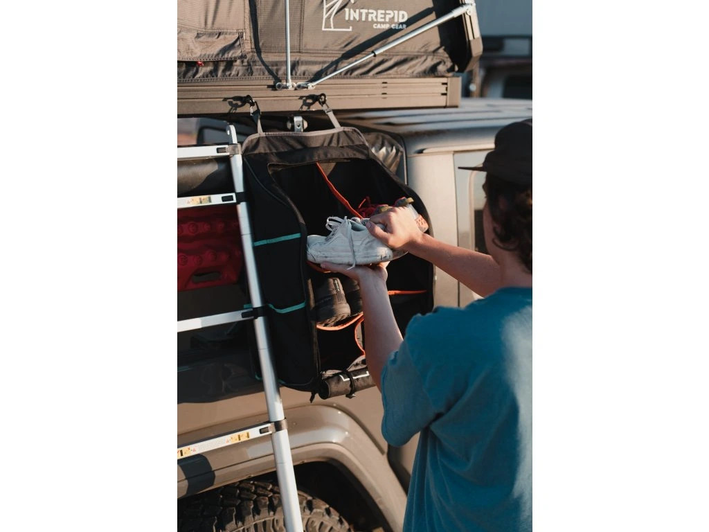 Pevná závěsná taška se 6 vnitřními přihrádkami na obuv a 8 vnějšími kapsami, vodoodpudivým rolovacím krytem a karabínovými úchyty – ideální pro udržení čistoty a pořádku ve vašem stanu. Tyrkysový lem pro lepší viditelnost v noci.