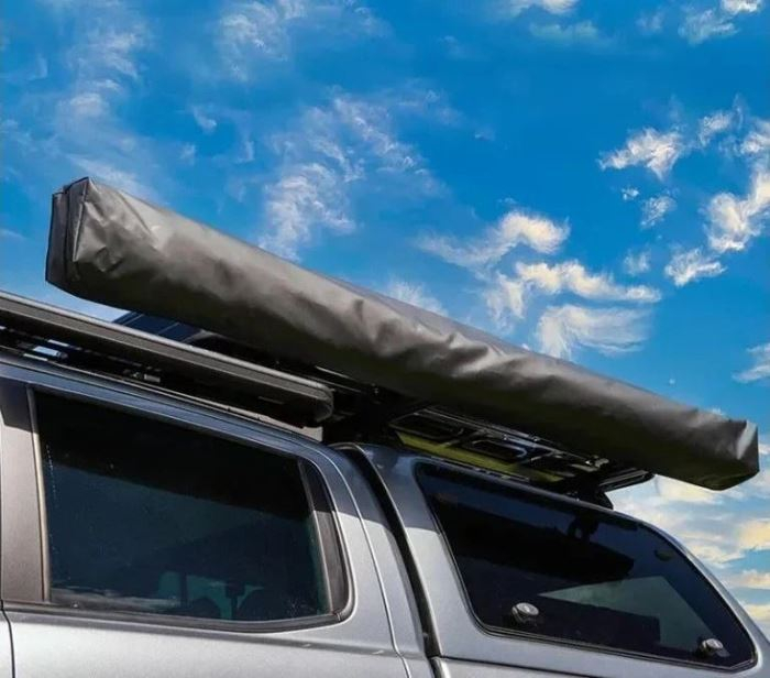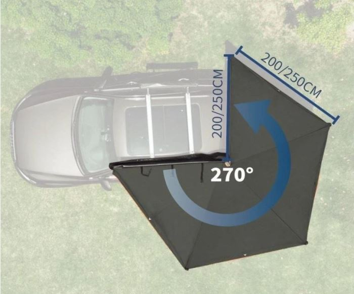 Markýza 270° na řidičův bok auta z vysoce odolného Oxford materiálu s hodnotou vodního sloupce 3000mm, montážní ocelové Lka například na příčníky.