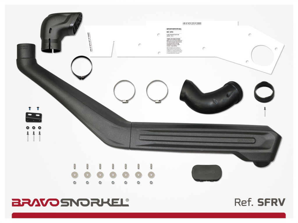 Snorkel Bravo pro Ford Ranger Raptor (2023–, diesel) je vysoce kvalitní příslušenství navržené pro zlepšení výkonu vašeho vozidla v náročných podmínkách. Tento snorkel je vyroben z prvotřídního polyethylenu ExxonMobil LLDPE LL 8446.21, což zajišťuje jeho odolnost a dlouhou životnost. Součástí balení je snorkel, hlavice a veškeré potřebné příslušenství pro instalaci. Produkt je dodáván s certifikátem shody s evropskými směrnicemi (EC) pro použití na veřejných komunikacích.