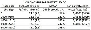- Tažná síla: 8,000 lbs. (3 629 kg) na první vrstvě lana